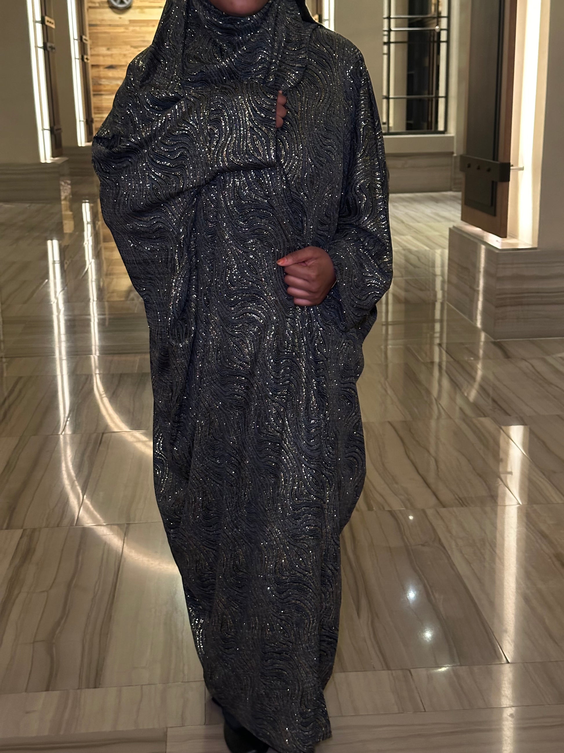 Radiate elegance with our Ahlam Abaya. Ahlam is the perfect choice for women seeking a sophisticated, fashionable abaya that radiates grace and style. The true highlight of Ahlam lies in the fabric. While it shimmers and shines, the abaya's slip satin dress is soft against the skin, ensuring comfort for prolonged wear. Ahlam is a three-piece set