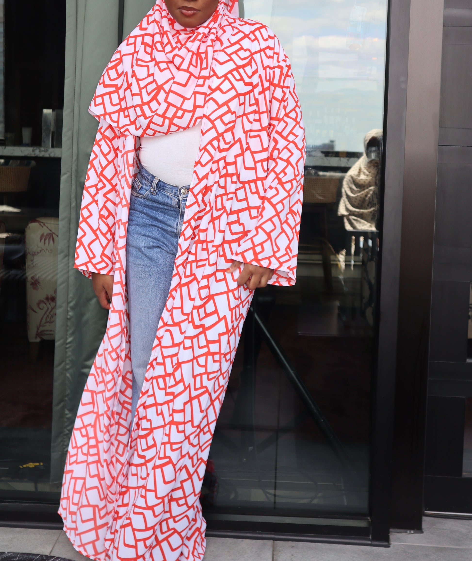The bold orange geometric pattern on a crisp white base adds a playful yet elegant summer vibe, making it the perfect go-to outfit for warm-weather days.